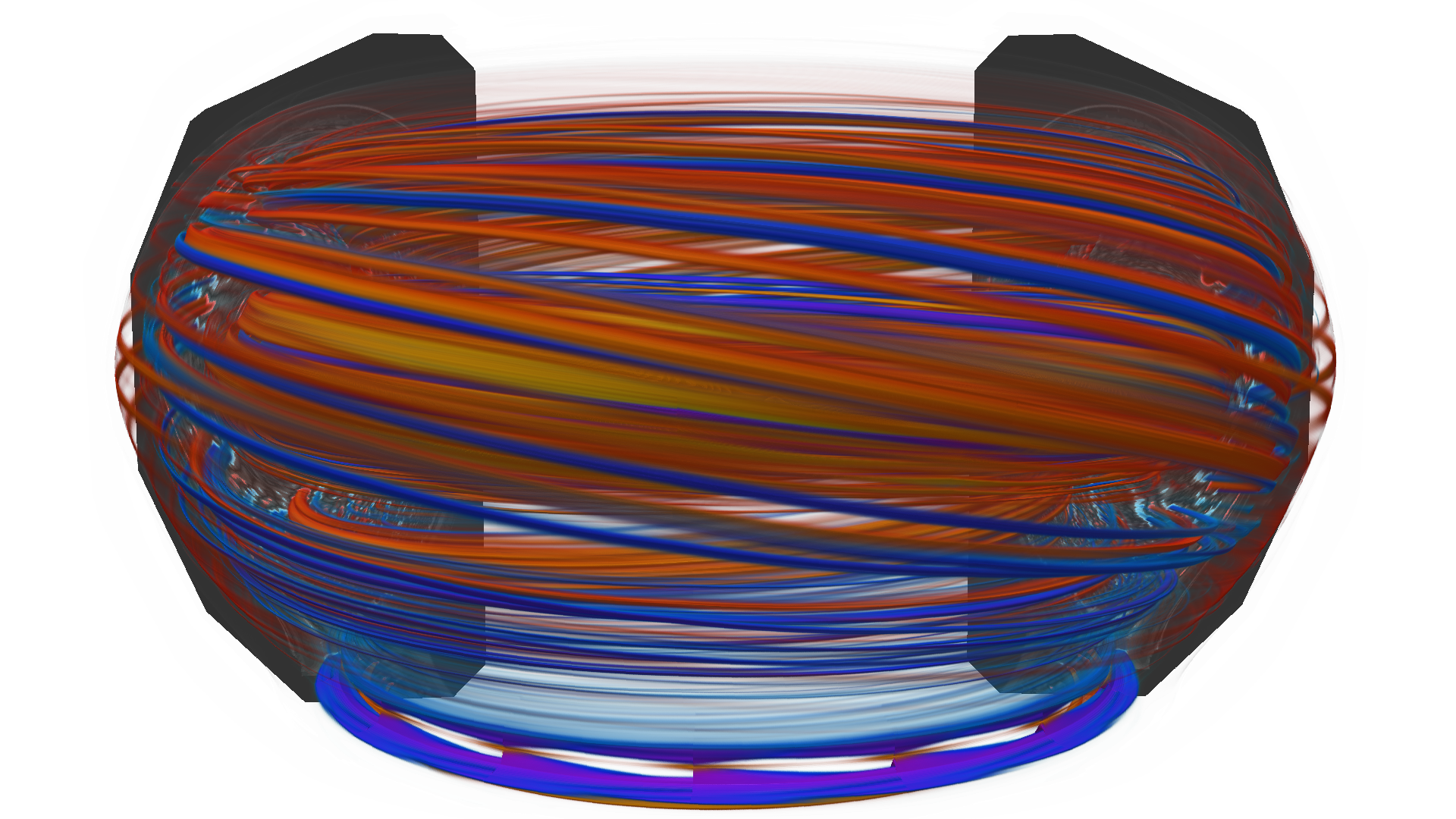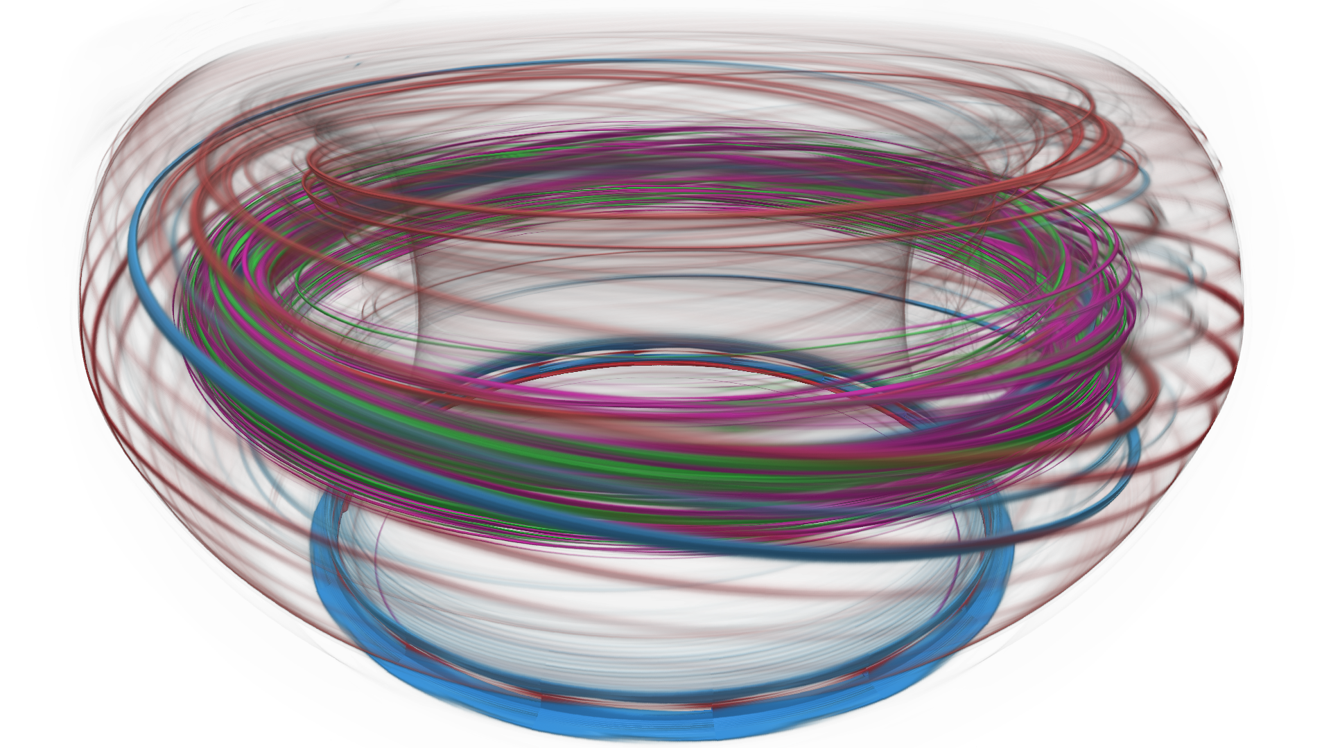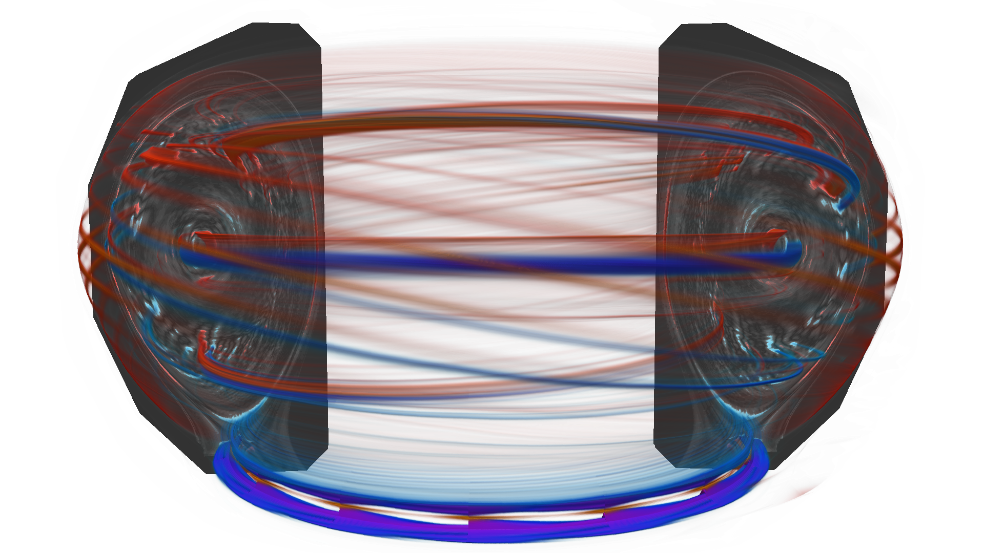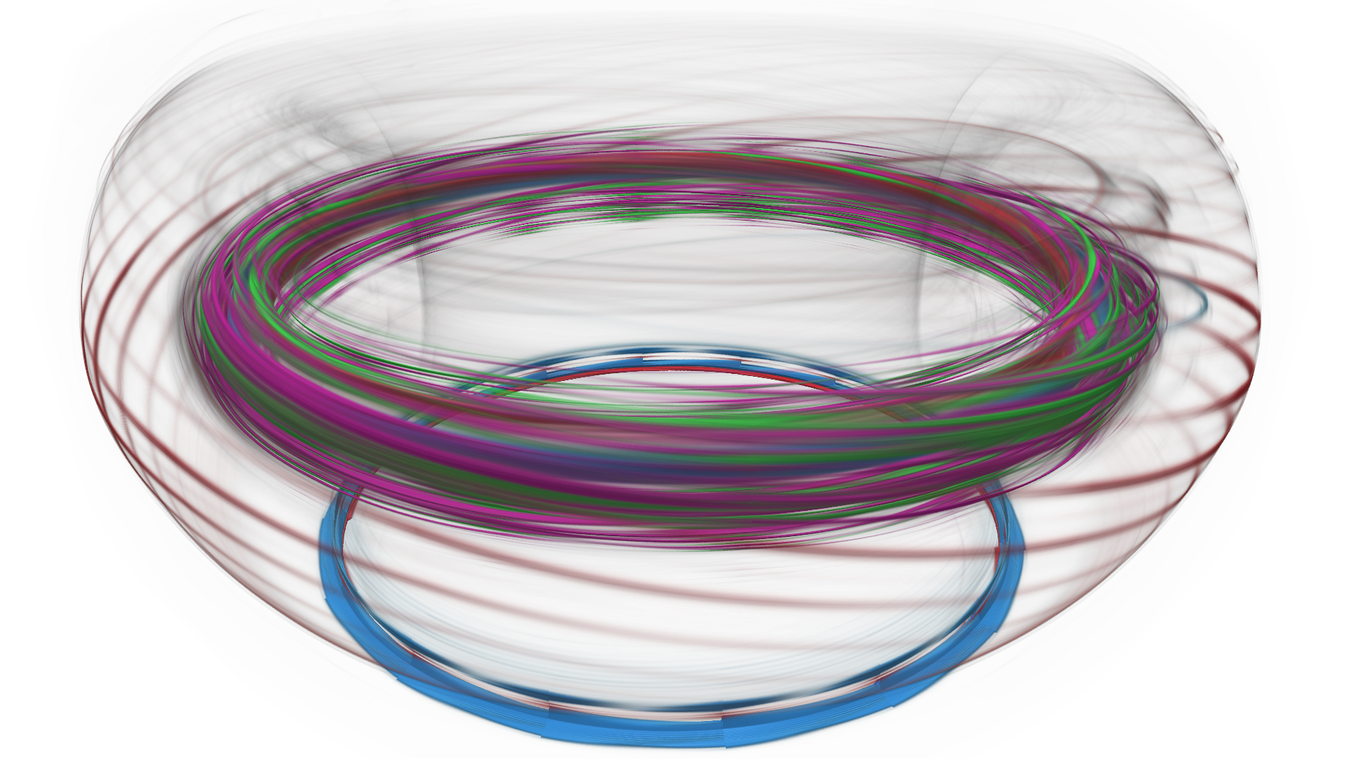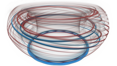 Here we hope to gain a better understanding of the results of a tokamak simulation by using direct volume rendering to render multiple bands from the simulation. Scalars are mapped to colors and opacities with a one dimensional transfer function. An example is shown in the figure 1-(a), the original dataset is rendered with blue representing the negative values while red represents the positive values. Without frequency analysis, it is difficult to discern movement between different frequency bandpasses.