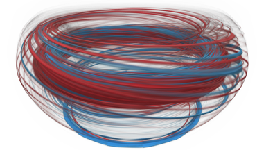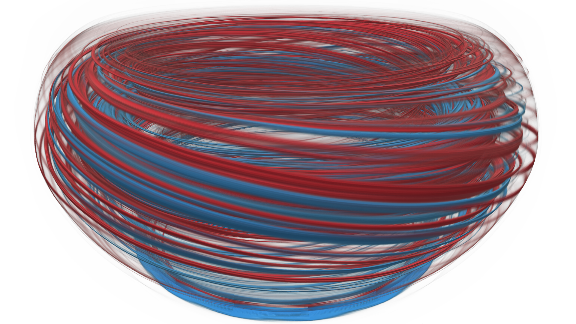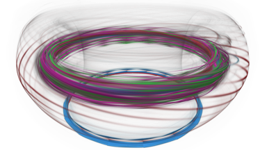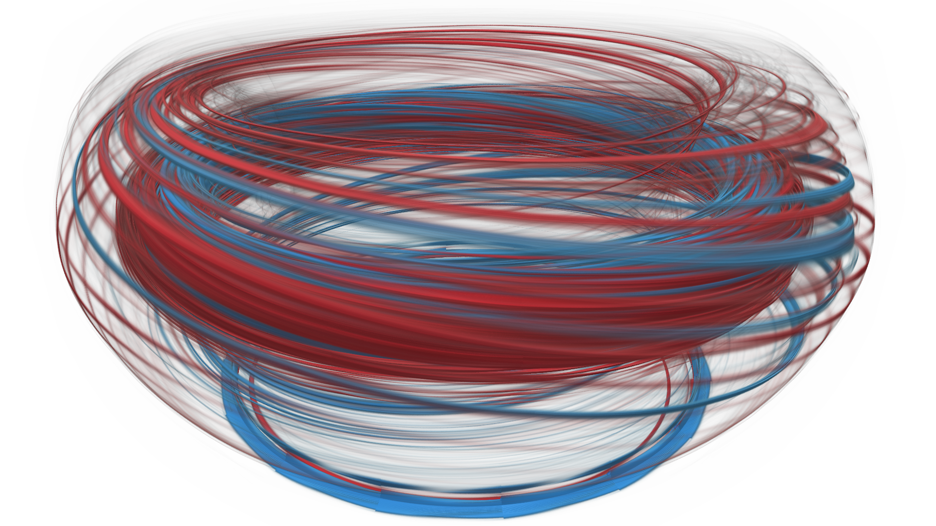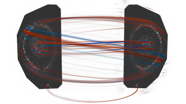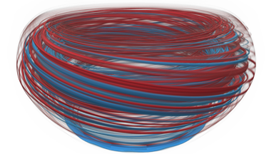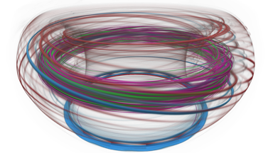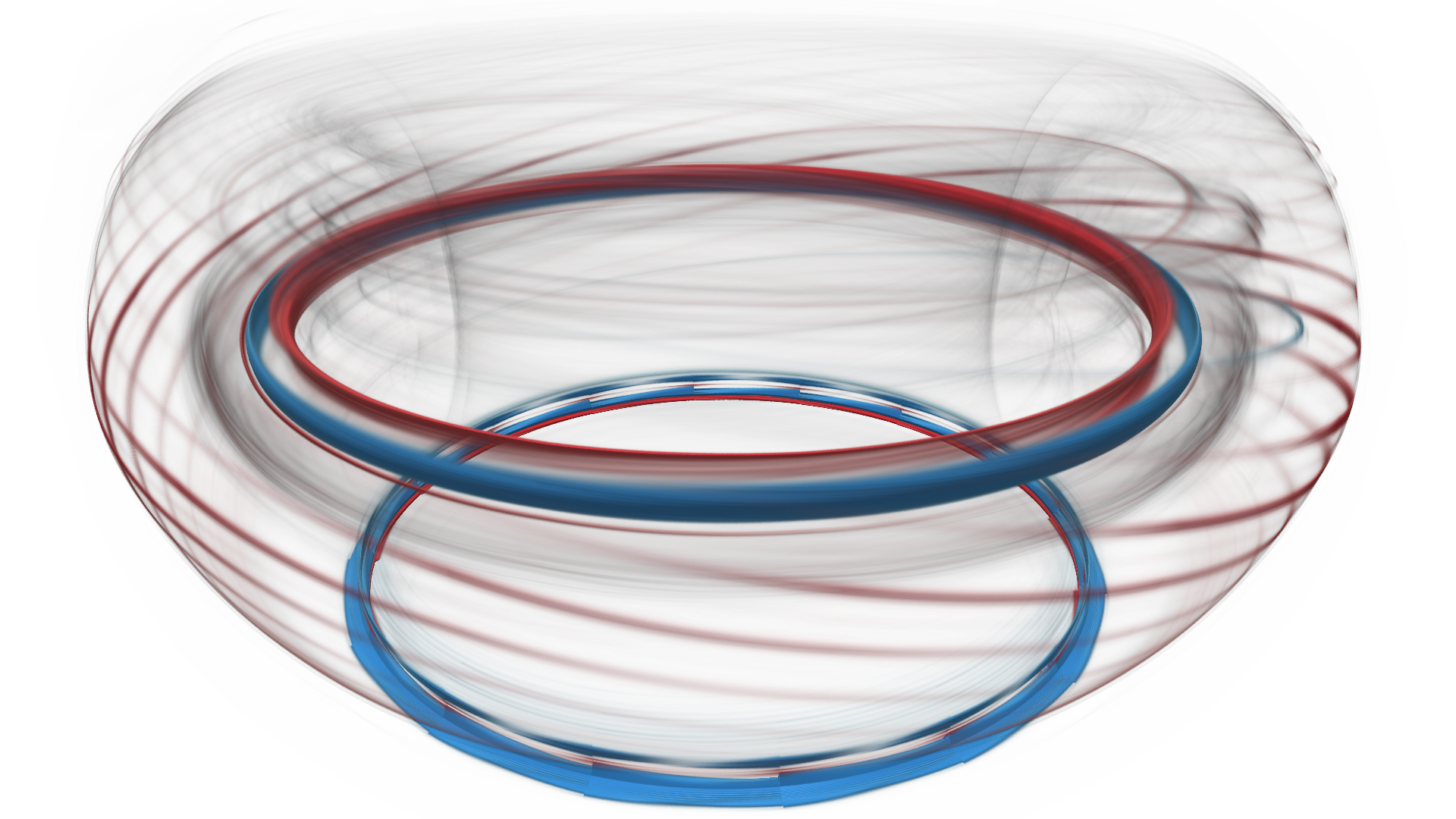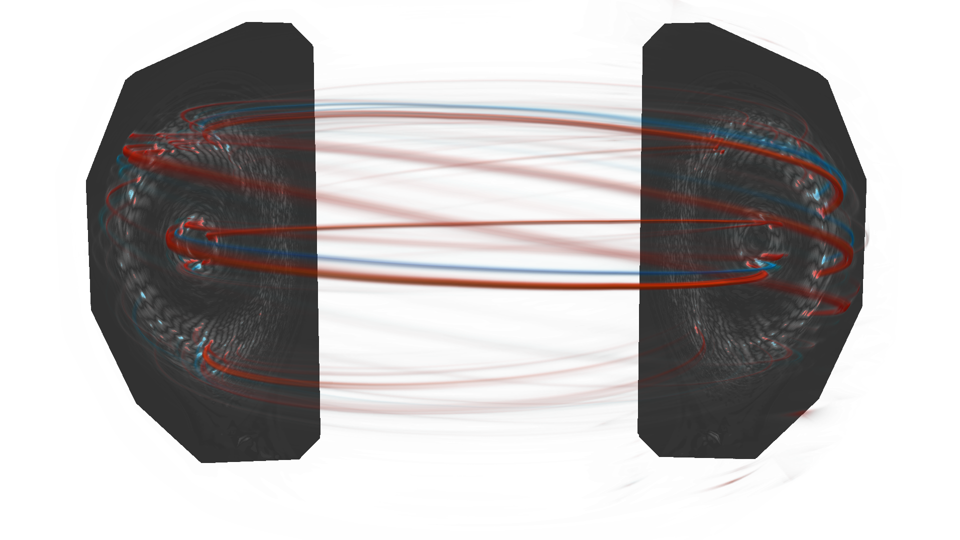 Here we hope to gain a better understanding of the results of a tokamak simulation by using direct volume rendering to render multiple bands from the simulation. Scalars are mapped to colors and opacities with a one dimensional transfer function. An example is shown in the figure 1-(a), the original dataset is rendered with blue representing the negative values while red represents the positive values. Without frequency analysis, it is difficult to discern movement between different frequency bandpasses.
